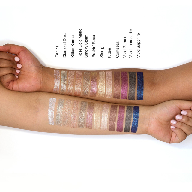 – 6 x 0.153 oz/ 4.5 mL Shimmer & Glow Liquid Eye Shadow in Starlight (light gold champagne), Kitten (vibrant nude pink), Contessa (sunlit sable), Vivid Garnet (vivid pomegranate), Vivid Labradorite (charcoal), Vivid Sapphire (vibrant dark blue)